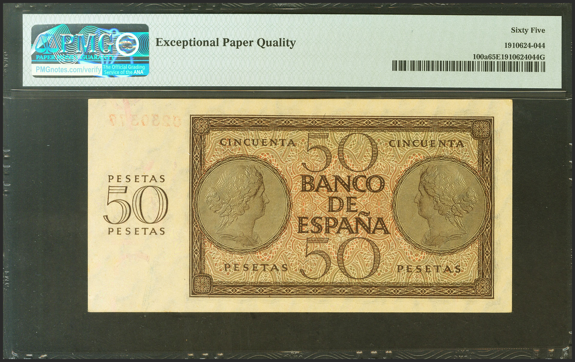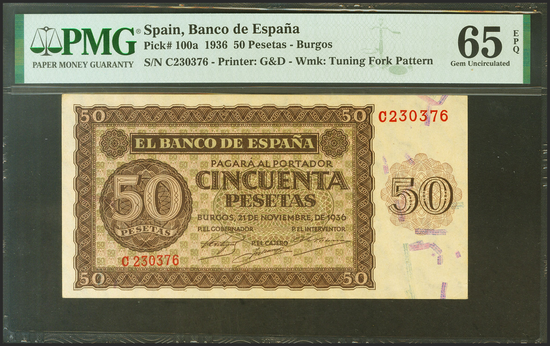 50 Pesetas. 21 de Noviembre de 1936. Serie C. (Edifil 2021: 420a). Inusual en esta excepcional calidad, apresto original. SC. Encapsulado PMG65EPQ.